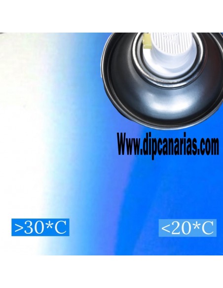 Full Dip Termocromático tiene la particularidad de cambiar de color en función de la temperatura, así pues, por debajo de 30º se mostrarán el color azul y por encima de 30º tenderá a neutralizarse el color, quedando un color semitransparente blanco pudiéndose incluso crear transparencias con diferentes fondos.